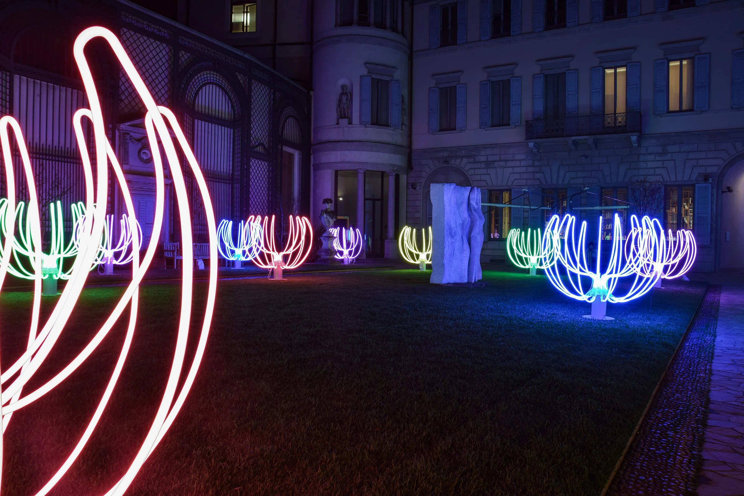 The installation consists of 13 suspended lamps mounted in the colonnade of Palazzo Anguissola and 19 lamps positioned in the Alessandro Garden, Manzoni's home. The lamps hanging in the colonnade are all lit and blue; Made by hand with blown glass tubes, they are shaped at sight and filled with NE-neon noble gas.